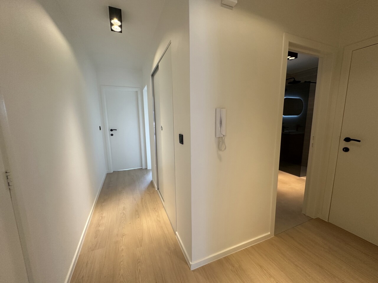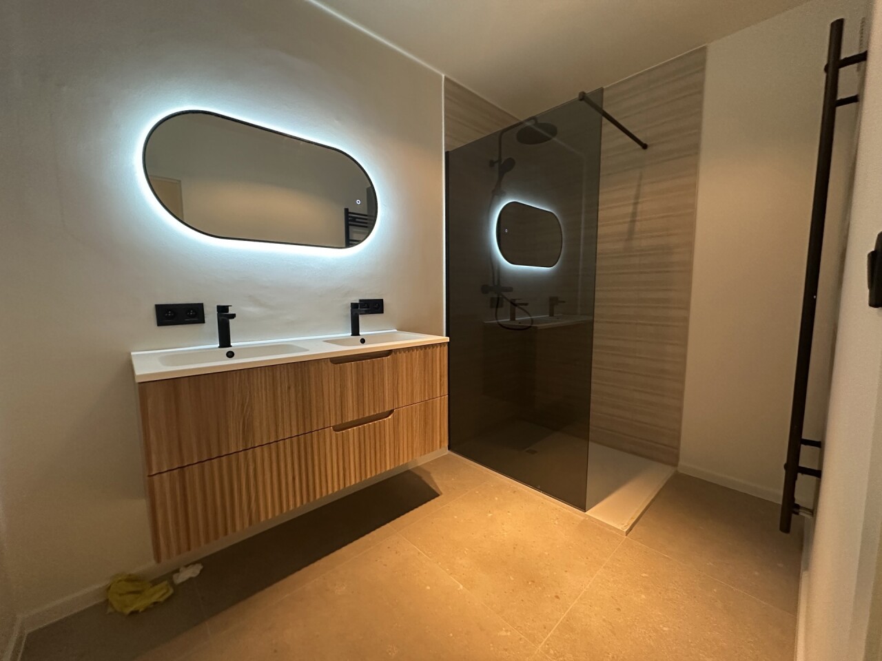 De nieuwe badkamer is uitgerust met een ruime inloopdouche, modern wastafelmeubel en een led-verlichte spiegel. Daarnaast is er een apart toilet met handenwasser en een praktische berging met aansluiting voor wasmachine en droogkast.