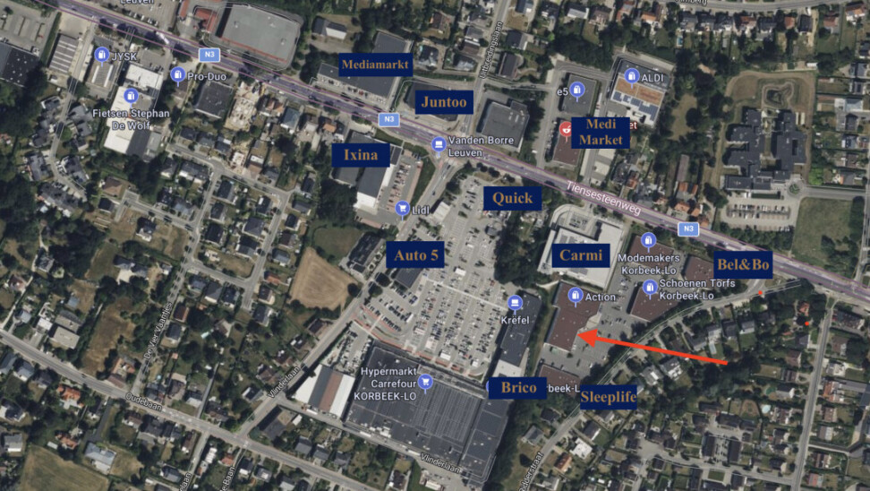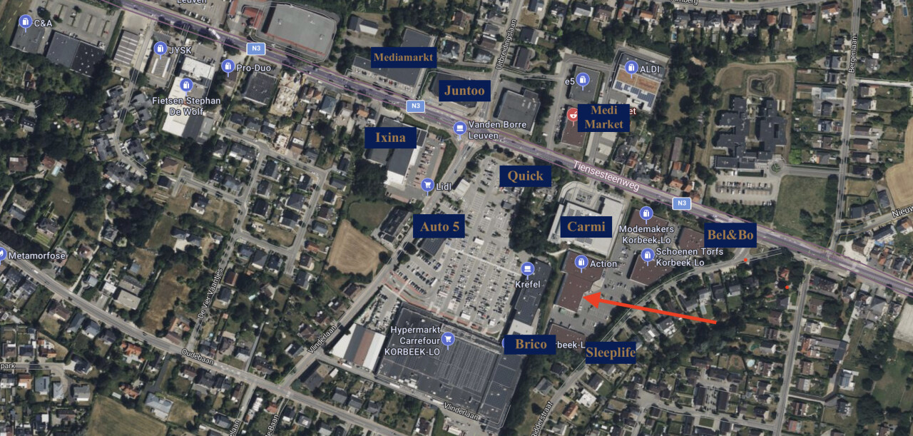 Commerciële ruimte +/- 1.000 m² gelegen op een retailpark met onder andere Action, Torfs, Modemakers, Bel&Bo en Sleeplife. Naast het retailpark bevindt zich de Carrefour-hypermarkt met Brico, Krëfel, Quick en Lunch Garden.