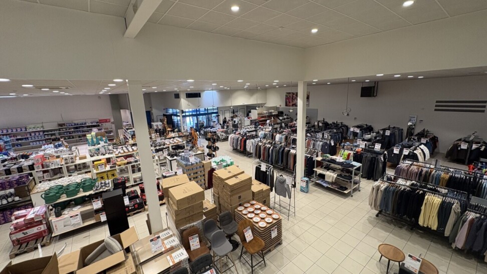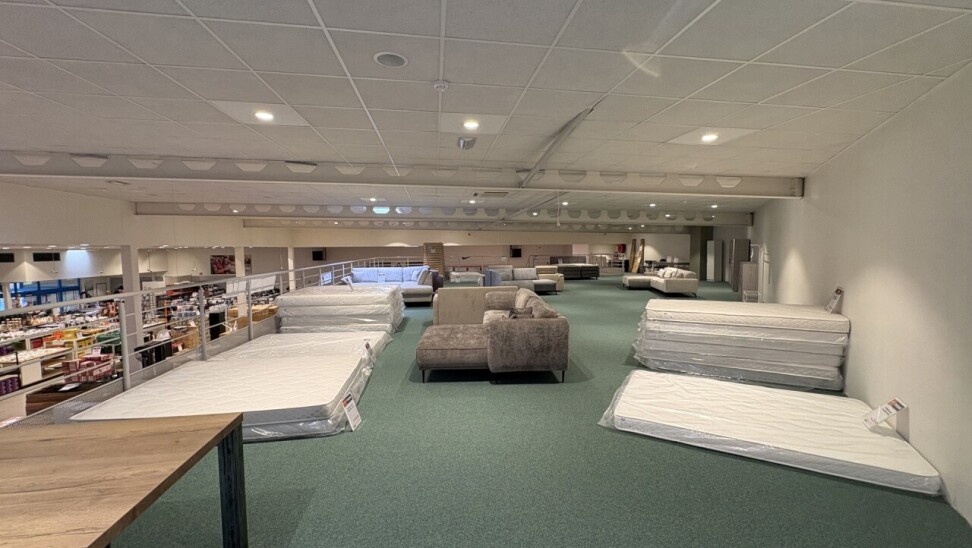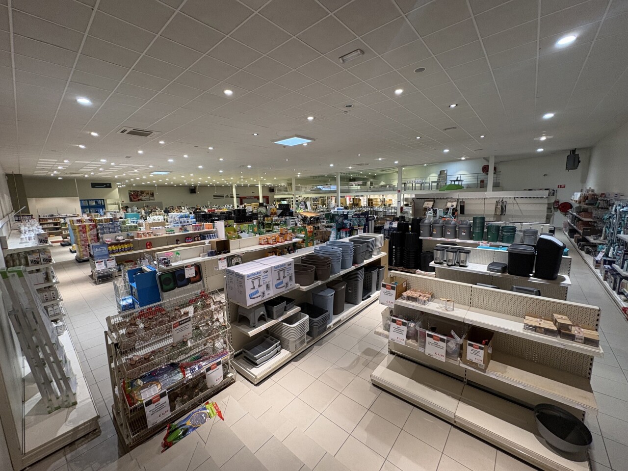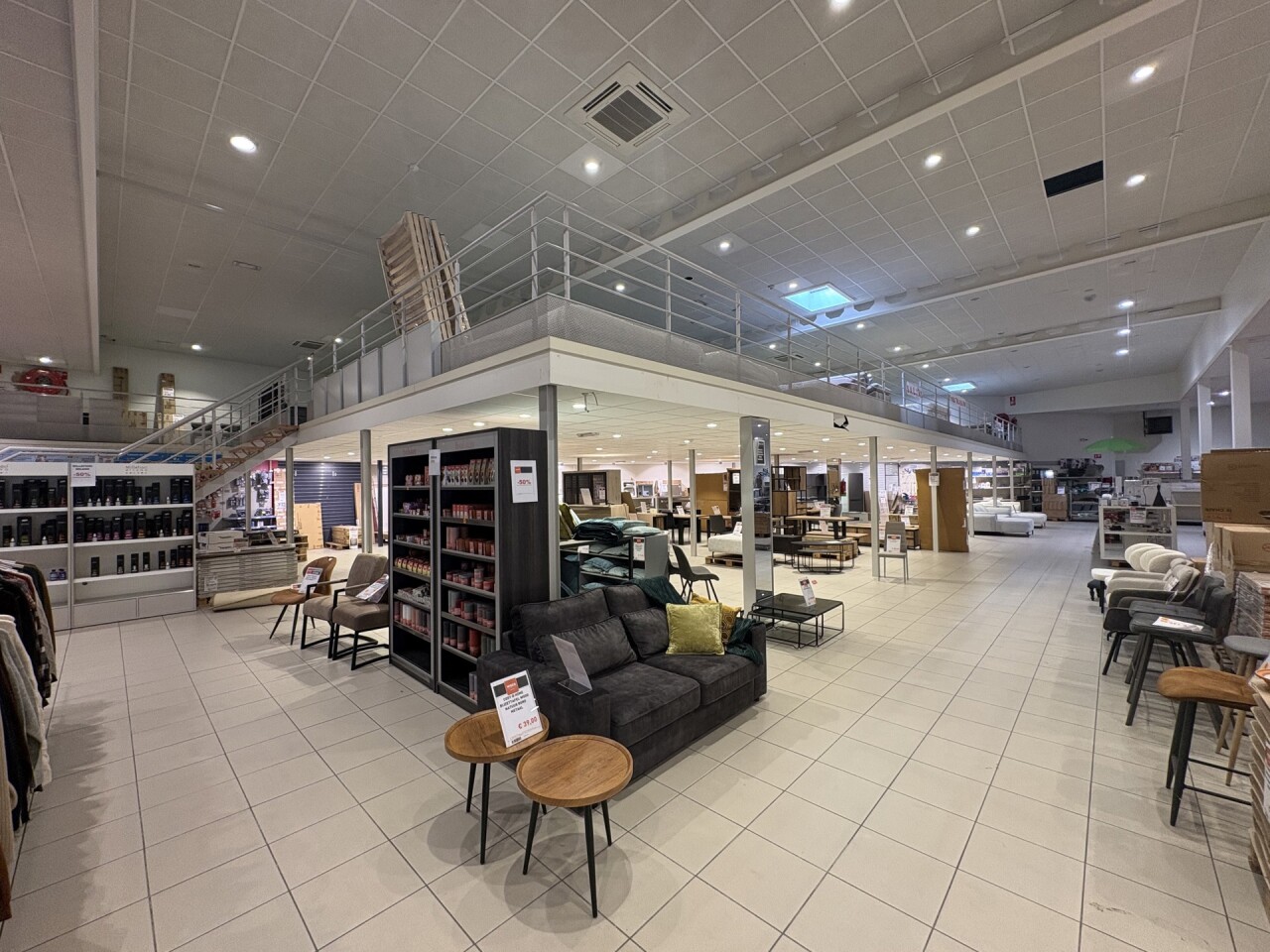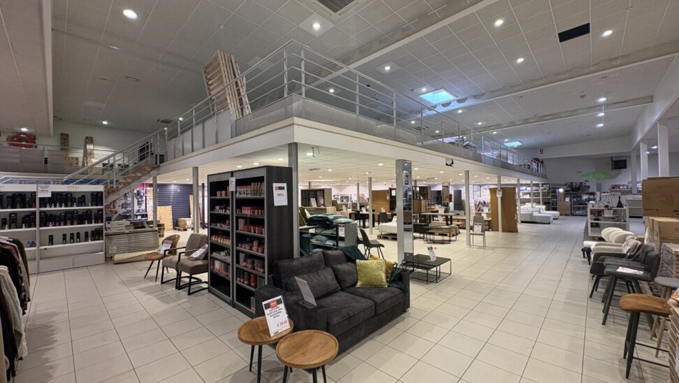 De winkel beschikt over een ingebouwde mezzanine van ca. 240 m², ideaal als extra verkoopruimte of opslag.