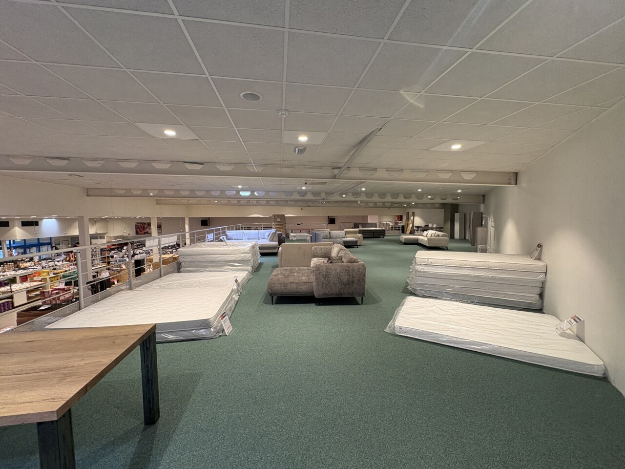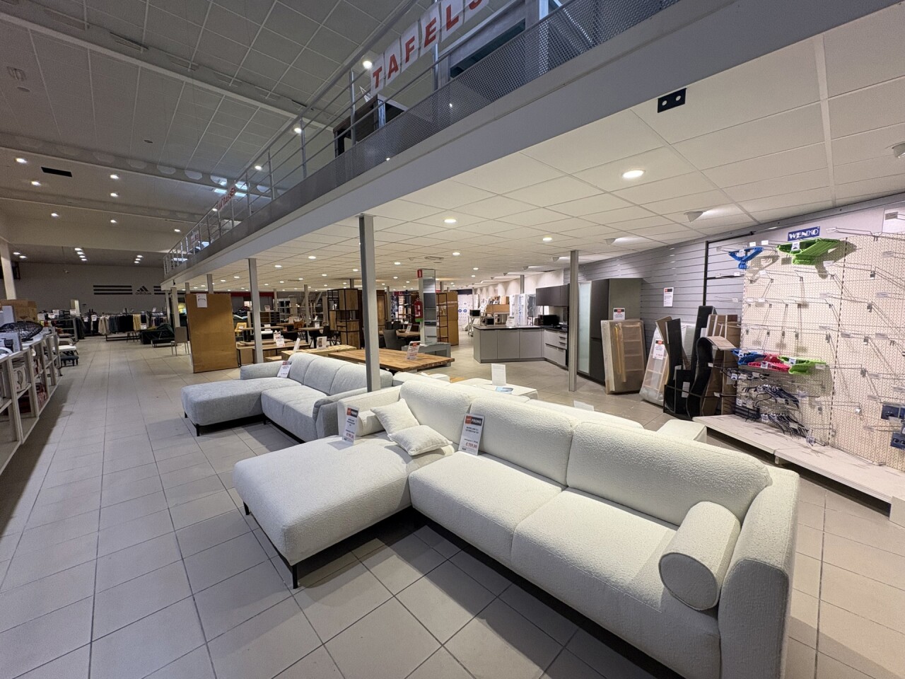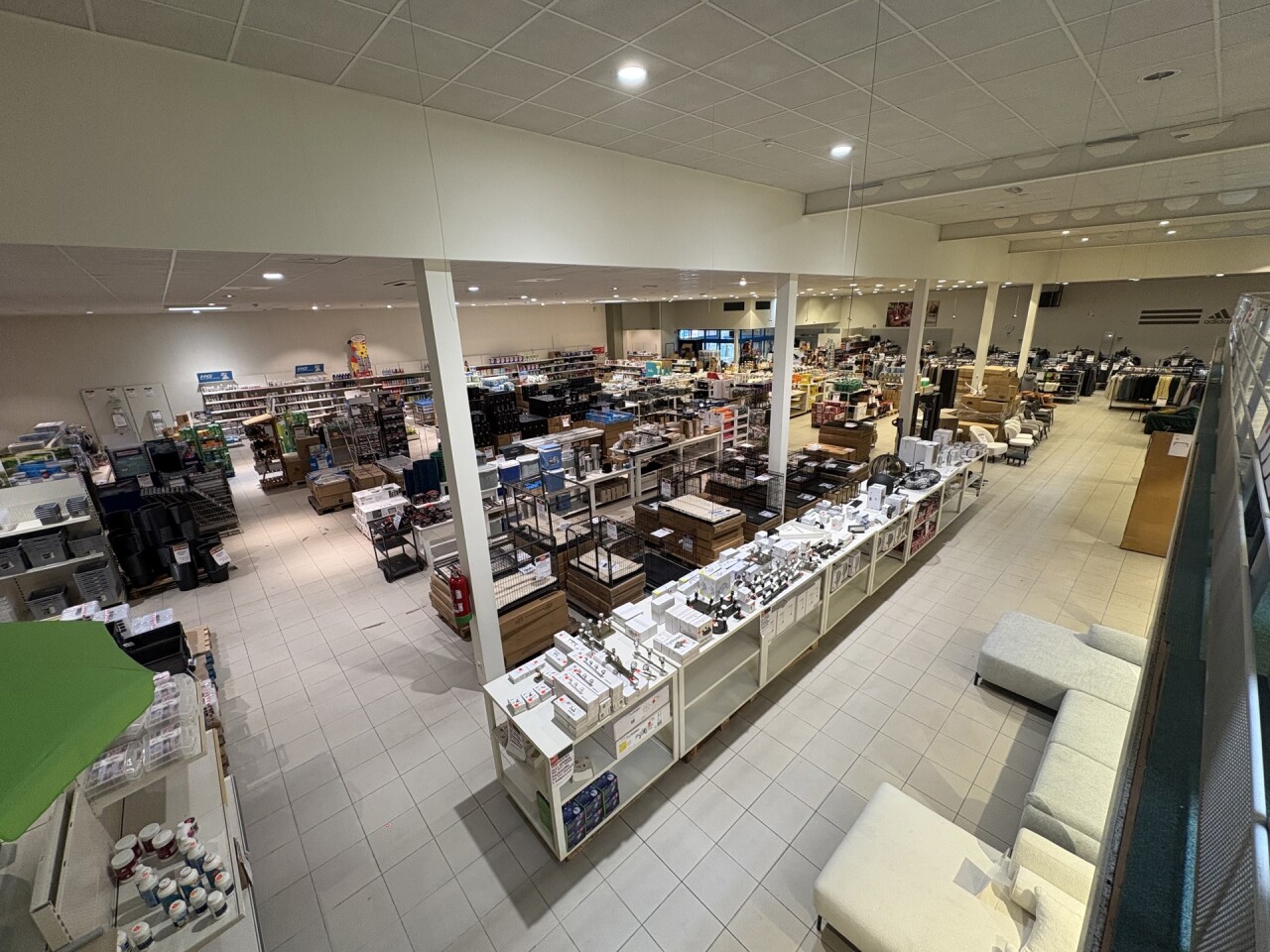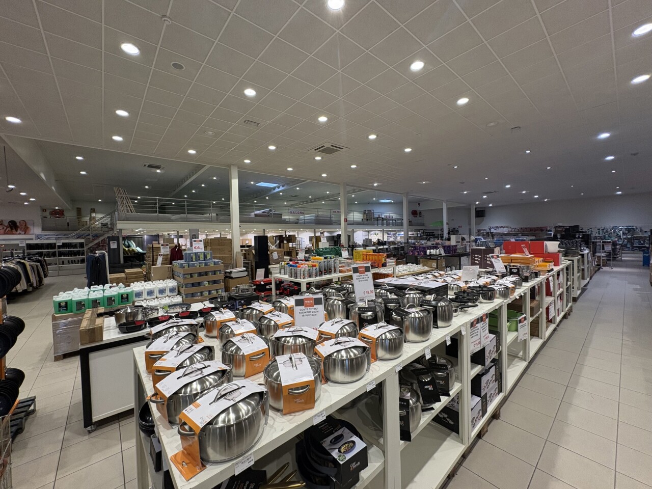 De winkel beschikt over een ingebouwde mezzanine van ca. 240 m², ideaal als extra verkoopruimte of opslag.