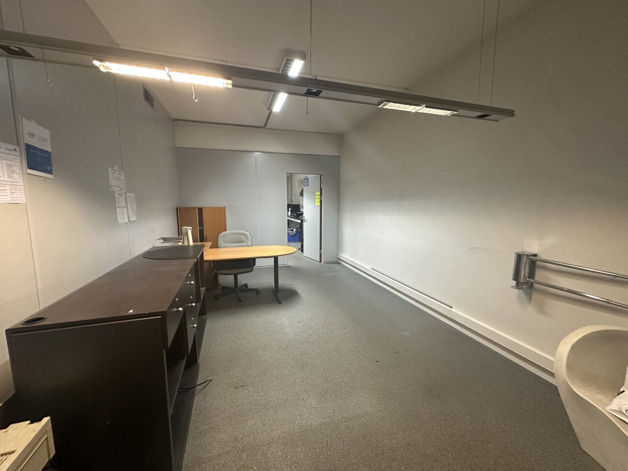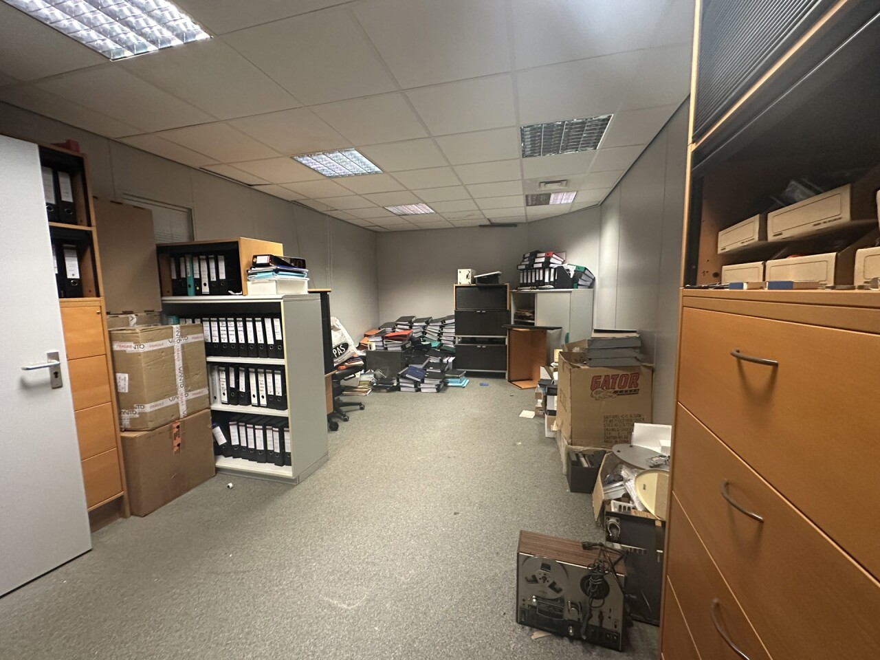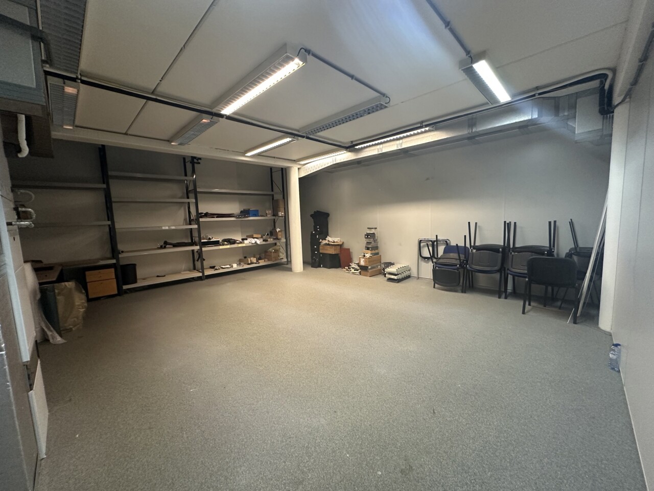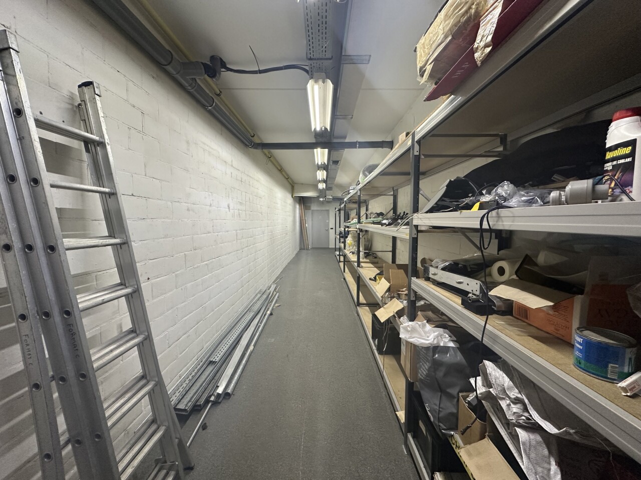 Achteraan zijn meerdere aparte ruimtes voorzien, waaronder een bureel voor administratie en een opslaggedeelte dat ideaal is voor stock of logistiek.