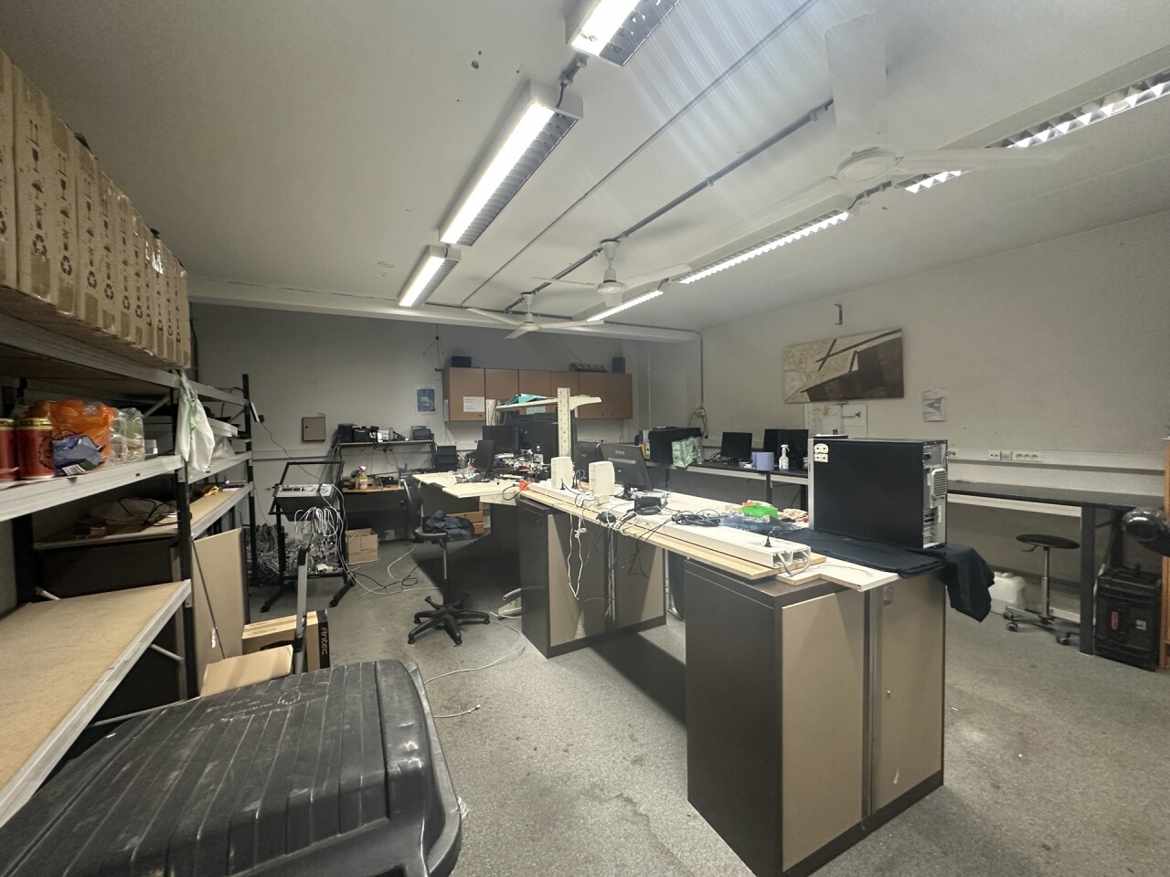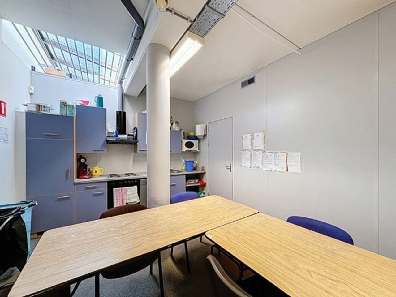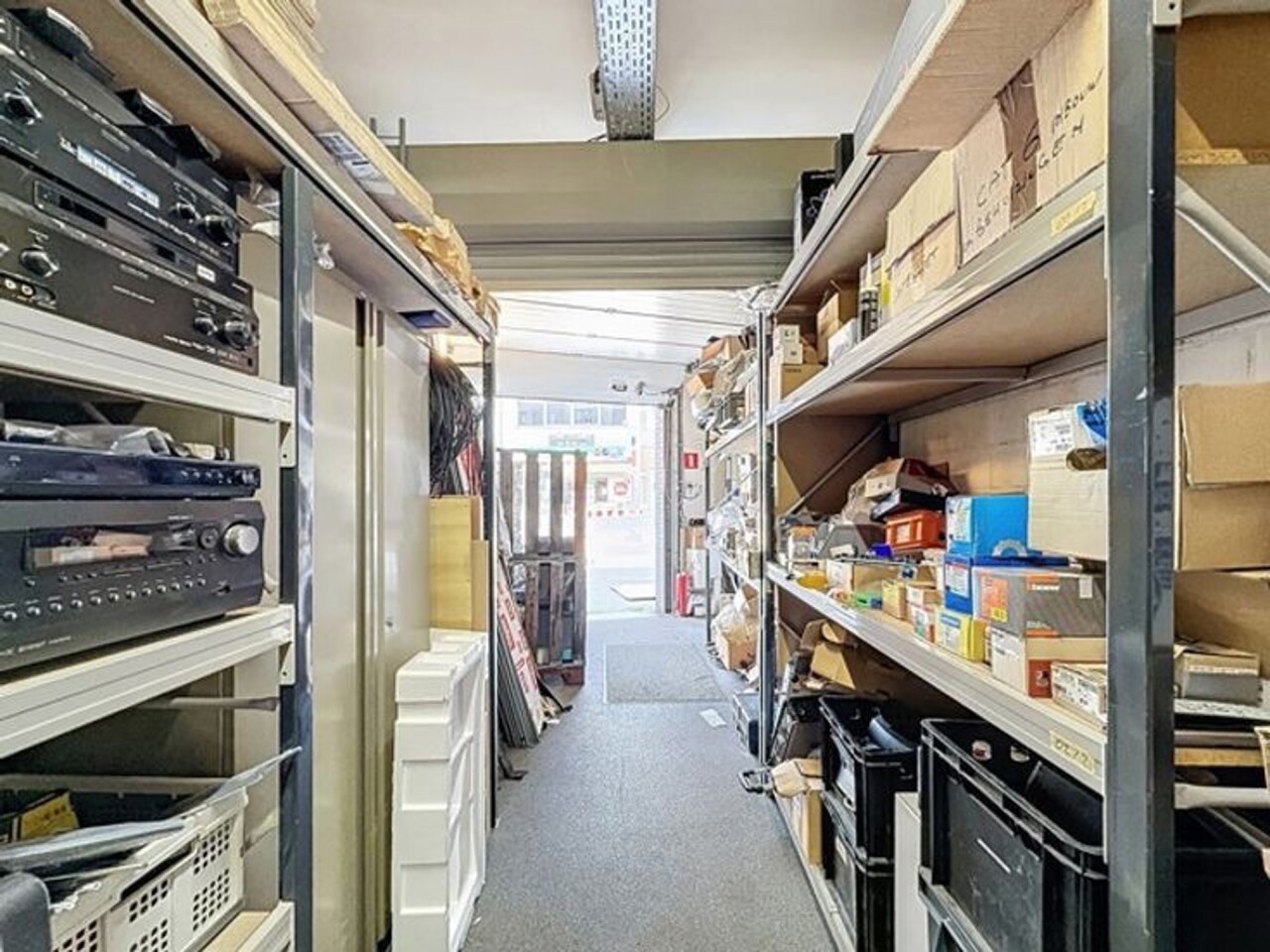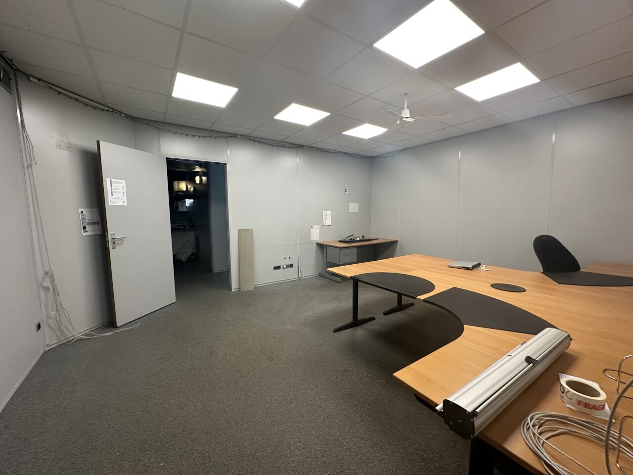 Achteraan zijn meerdere aparte ruimtes voorzien, waaronder een bureel voor administratie en een opslaggedeelte dat ideaal is voor stock of logistiek.