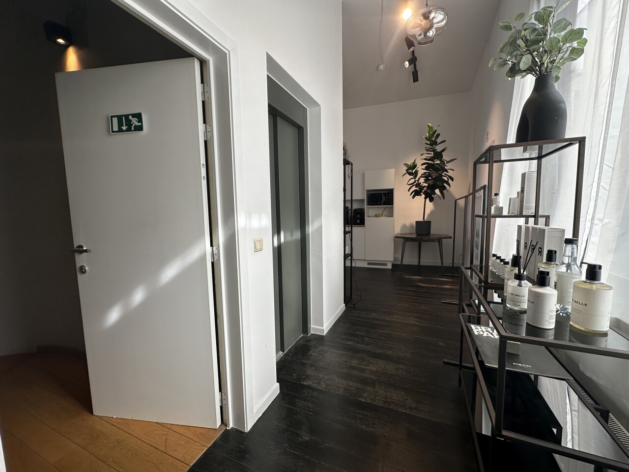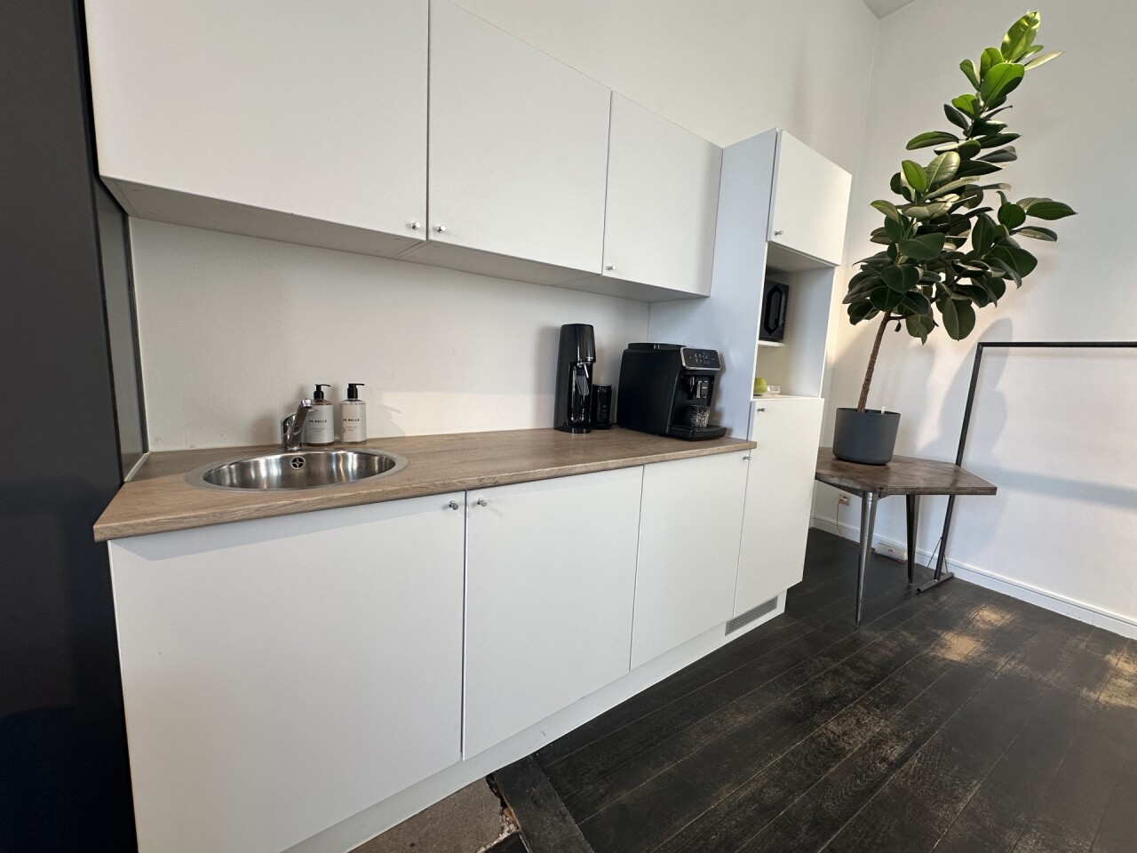 Het kantoor is volledig afgewerkt met parket en beschikt over veel ingebouwde kasten, waardoor er optimaal gebruik wordt gemaakt van de beschikbare ruimte. De indeling omvat een lichtrijke werkruimte, een kitchenette, een aparte toilet met handenwasser en een praktische technische berging.