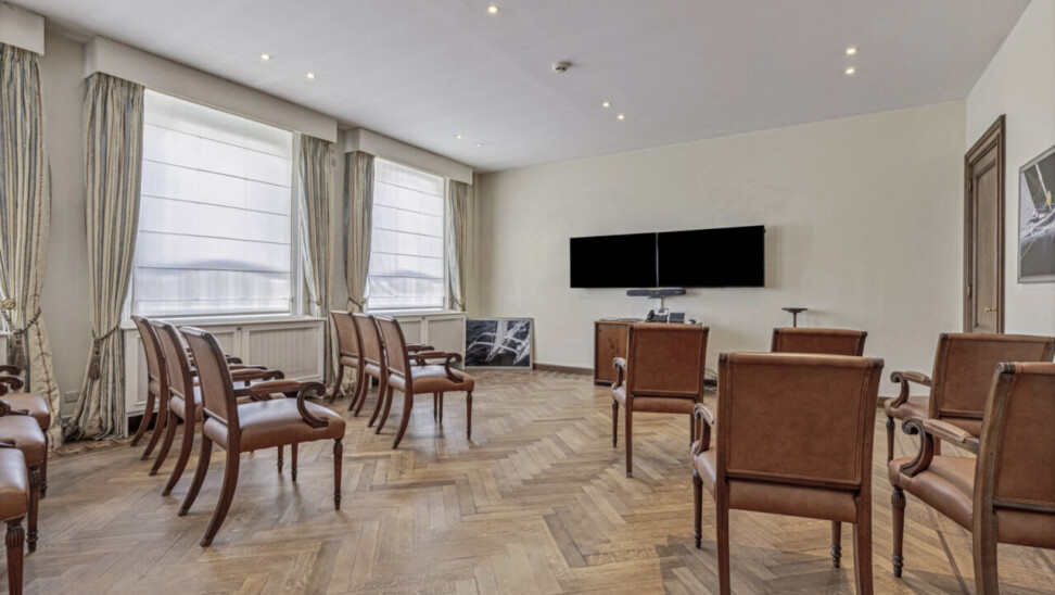 Op het gelijkvloers word je verwelkomd in een royale inkomhal met een indrukwekkende eikenhouten trap die meteen de toon zet. Aan de voorzijde bevinden zich twee ruime vergaderzalen die perfect geschikt zijn voor ontvangsten of besprekingen. Achteraan bevindt zich een galerij die extra mogelijkheden biedt voor ontvangst of expositieruimte.