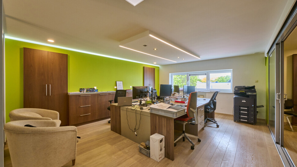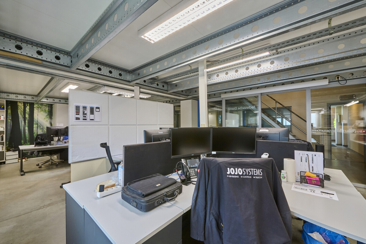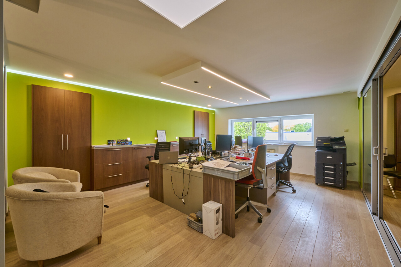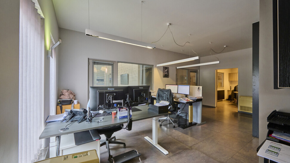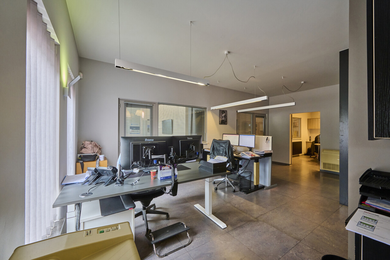 Het pand omvat meerdere kantoorruimtes, een ruime toonzaal (momenteel ingericht als kantoor), een technisch atelier en een magazijn- of productieruimte. Aan de voor- en zijkant zijn ruime parkeermogelijkheden voorzien voor personeel en bezoekers.