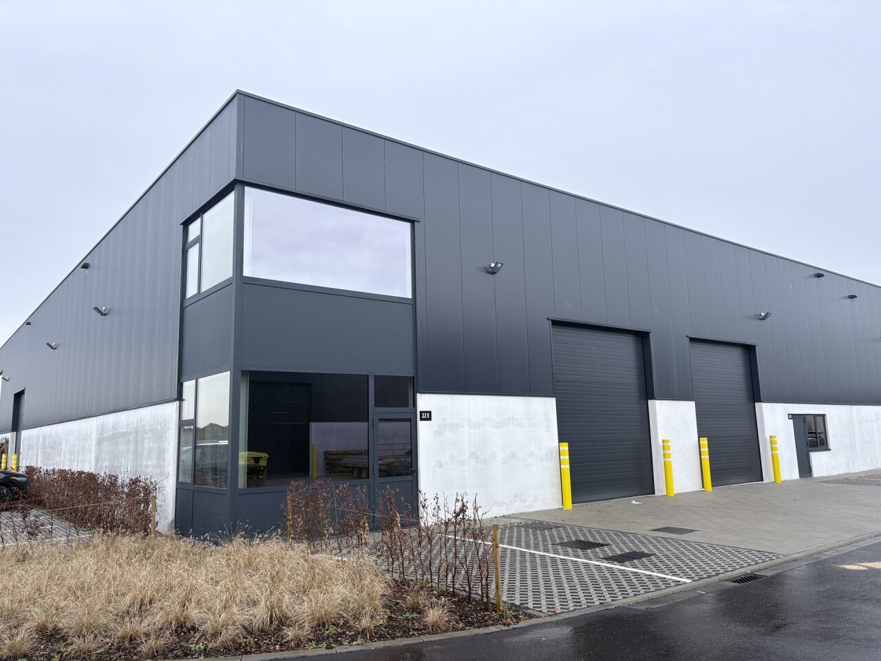 Elke unit is voorzien van een staalstructuur, grijs-alu buitenschrijnwerk en minimaal één sectionaalpoort. De gevels bestaan uit isolatiepanelen in een donkergrijze kleur, en de scheidingswanden zijn uitgevoerd in betonnen panelen met een brandwerendheid van EI60 of EI120. De vloeren zijn afgewerkt met een glad gepolierde betonlaag, en de tussenvloeren hebben een nuttige belasting van 6 kN/m².