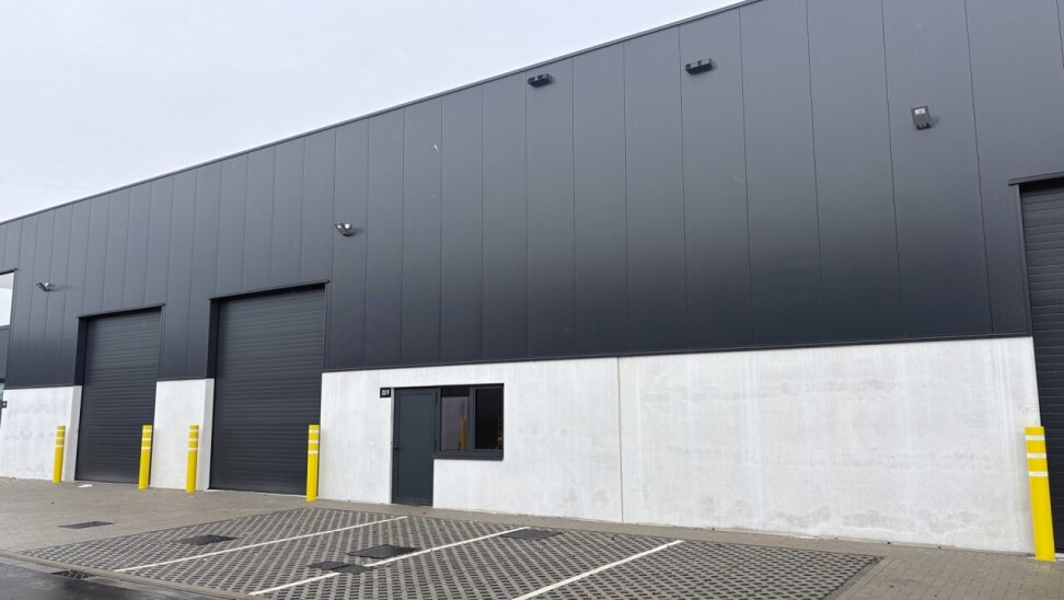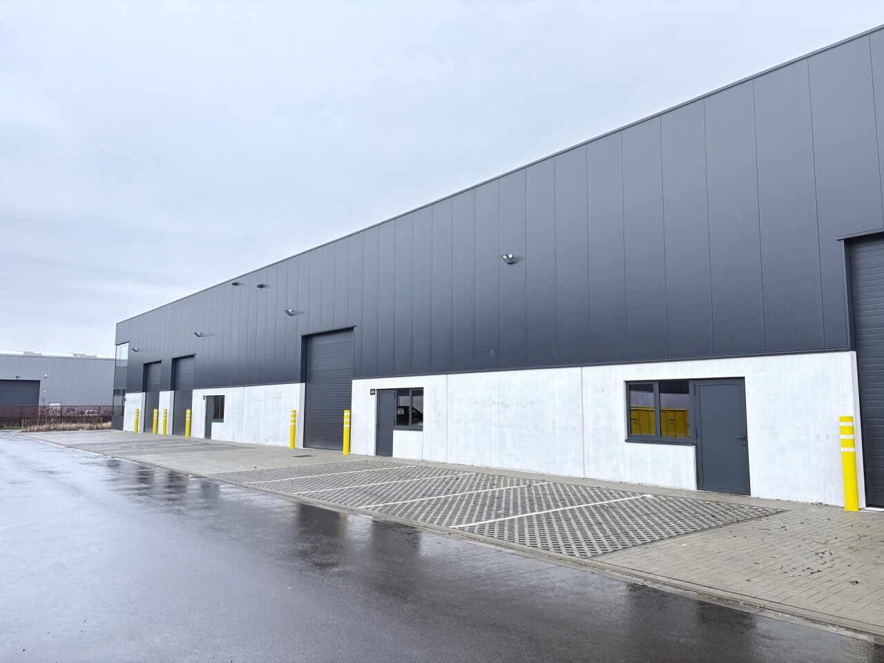 Elke unit is voorzien van een staalstructuur, grijs-alu buitenschrijnwerk en minimaal één sectionaalpoort. De gevels bestaan uit isolatiepanelen in een donkergrijze kleur, en de scheidingswanden zijn uitgevoerd in betonnen panelen met een brandwerendheid van EI60 of EI120. De vloeren zijn afgewerkt met een glad gepolierde betonlaag, en de tussenvloeren hebben een nuttige belasting van 6 kN/m².